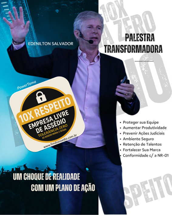A palestra 10X RESPEITO: EMPRESA LIVRE DE ASSÉDIO – Tolerância ZERO ao Assédio Moral e Sexual, com Edenilton Salvador, oferece as ferramentas e o conhecimento para construir uma cultura de respeito, segurança e alta performance, proporcionando um ambiente onde talentos crescem e resultados se multiplicam.